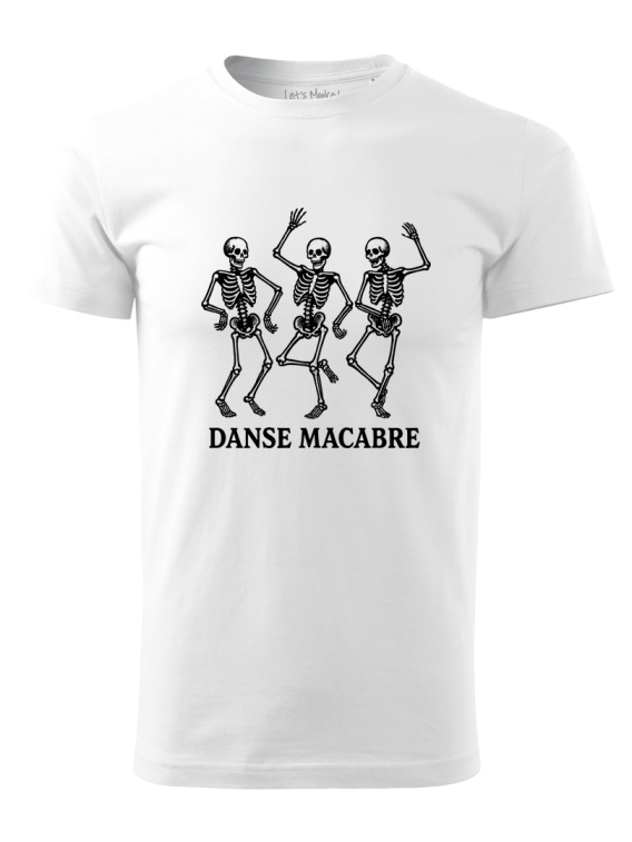 Koszulka z tańczącymi szkieletami i napisem „Danse Macabre”. Klasyczny motyw w lekkim, ironicznym wydaniu.